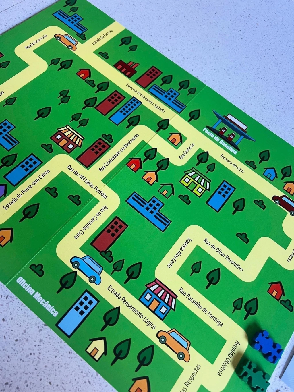 O jogador identifica em qual “quarteirão dos pensamentos” se encontra (agitado, desorganizado, calmo ou criativo) e utiliza cartas especiais — como Posto de Gasolina, Oficina Mecânica ou Lava Rápido — para mudar seu percurso. Assim, aprende de forma divertida a reconhecer e regular seu próprio funcionamento mental.